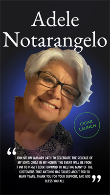 Join us, and special guest Adele Notarangelo, at Downtown Cigars on Saturday Jan 24th at 7pm for a release of "The Adele." This very special cigar has been years in the making and blending process, and will be released by owner Antonio Notarangelo in honor of his mother on the 24th. Everyone is invited to his event. Fully stocked bar; indoor and outdoor seating available. We look forward to seeing everyone!