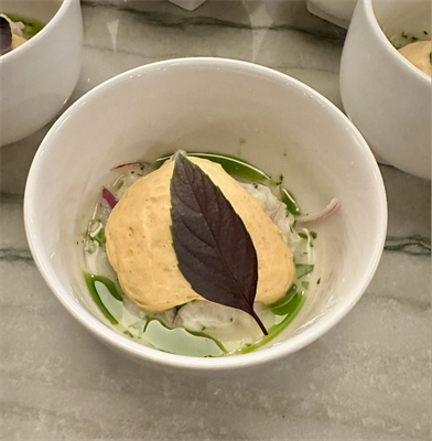 Local snapper crudo with sweet potato foam, citrus essence, and spicy crustacean oil.