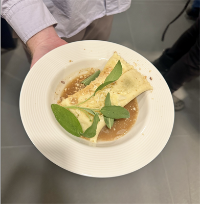 A double-filled raviolo: one side with sweet pumpkin purée, the other with tangy goat’s milk ricotta,