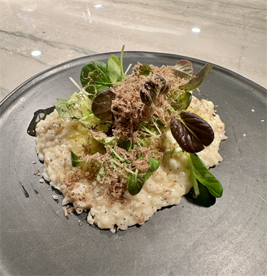 Creamy Carnaroli risotto enriched with Pecorino Romano and black pepper, finished with fresh black truffle shavings.