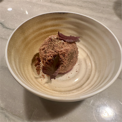 A dark chocolate mousse shaped like a truffle, revealing at its heart a white chocolate ganache infused with saffron, resting on a delicate sable.