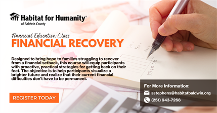 This financial education class is called “Financial Recovery.” Designed to bring hope to families struggling to recover from a financial setback, this course will equip participants with proactive, practical strategies for getting back on their feet. The objective is to help participants visualize a brighter future and realize that their current financial difficulties don’t have to be permanent.